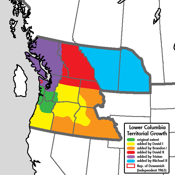 The campaign was concluded in 1729 - just in time for the national government to move to Kendall. The remainder of King Edward's rule was uneventful. He was, however, widely mourned following his death in 1736. His son was then crowned in the new National Cathedral, making him King David I. The main focus of David's reign was territorial expansion: until that time, Lower Columbia's territory only covered little more than the Columbia River valley from the start of the Gorge westward and the Willamette River Valley. He twice led campaigns to extend the borders of the country, first up the Snake River (1748-57) and subsequently along the Pacific coast and into the interior as far as the crest of the Cascade Range, as far as the present-day Californian border (1762-68). Unfortunately, at the conclusion of the Pacific Coast Campaign, the king, who led the military forces in person, suffered from a wound which proved fatal.